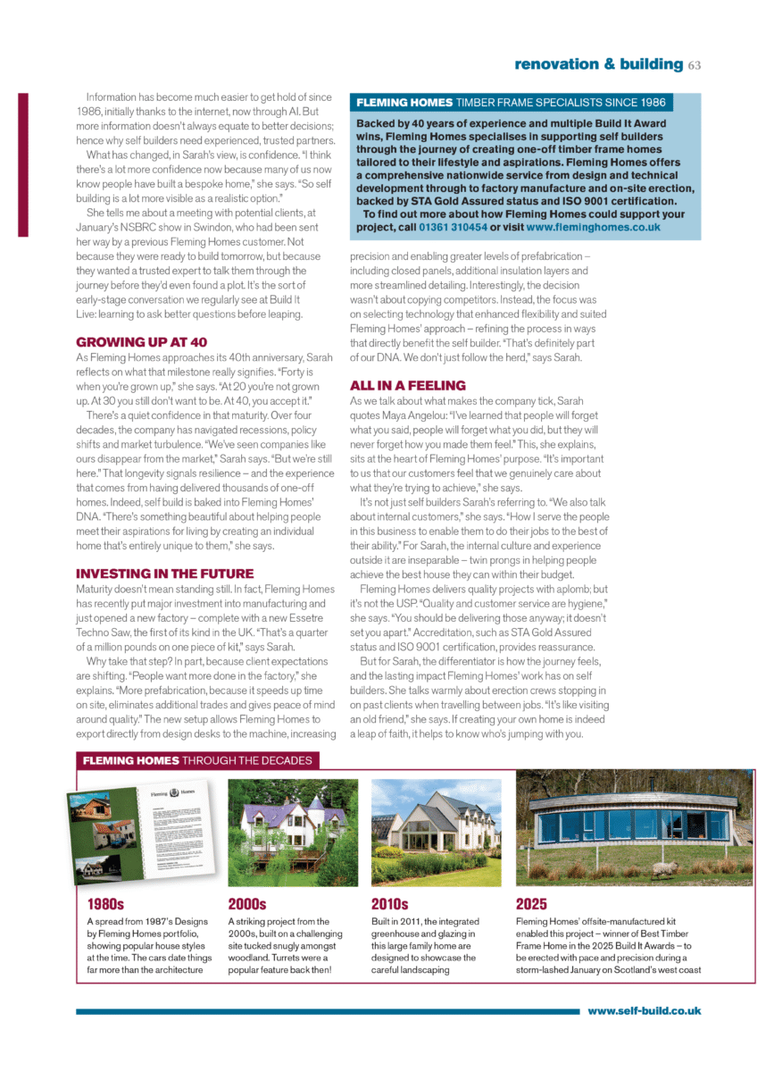It’s a thread that keeps surfacing in my conversation with Sarah Mathieson, managing director at Fleming Homes. Based in the Scottish Borders and known to many Build It readers for its award-winning projects, the family-run timber frame business celebrates its 40th anniversary this year.